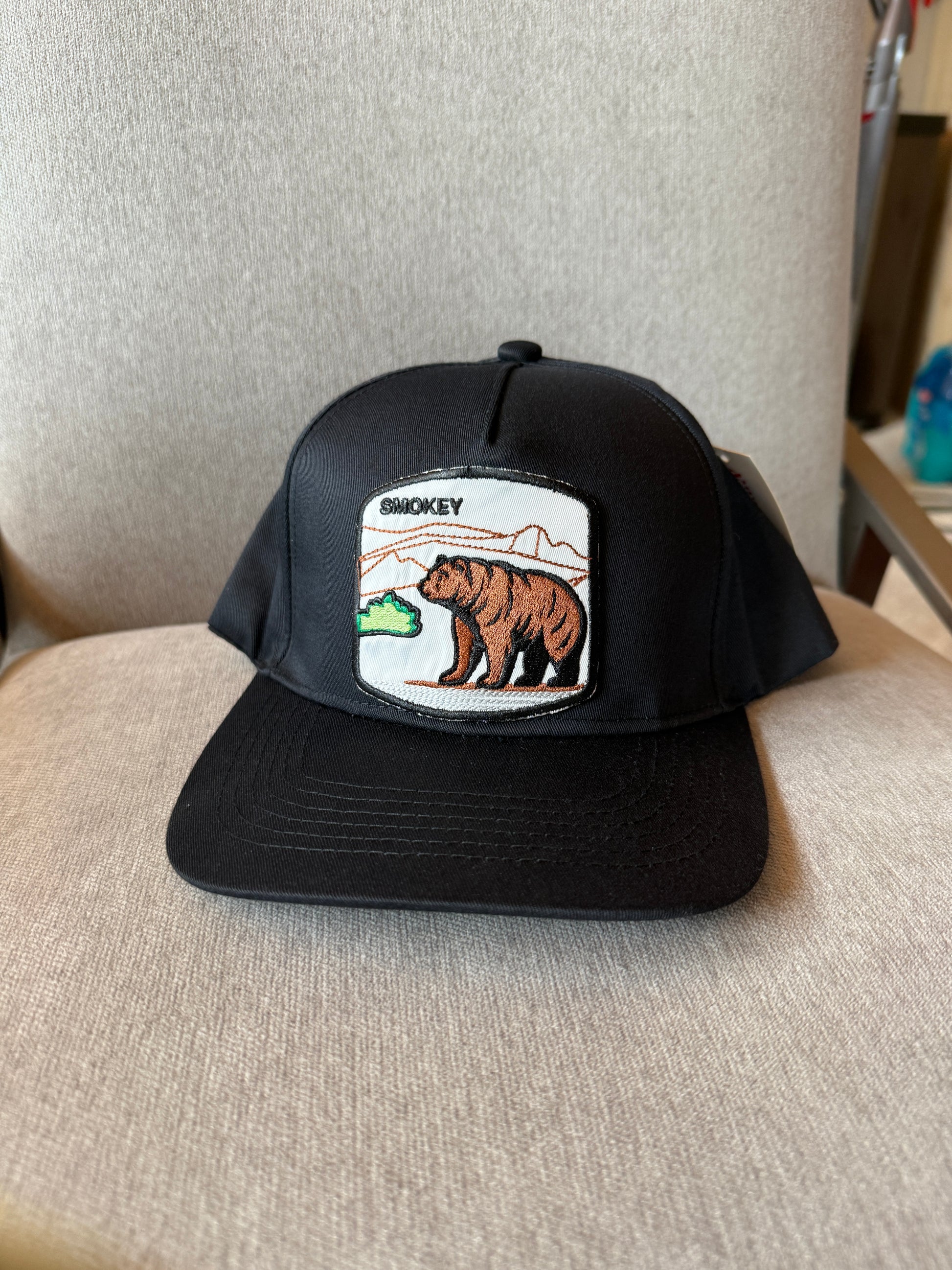 Hand embroidered smokey bear hat. Available in White, Black, or Beige.